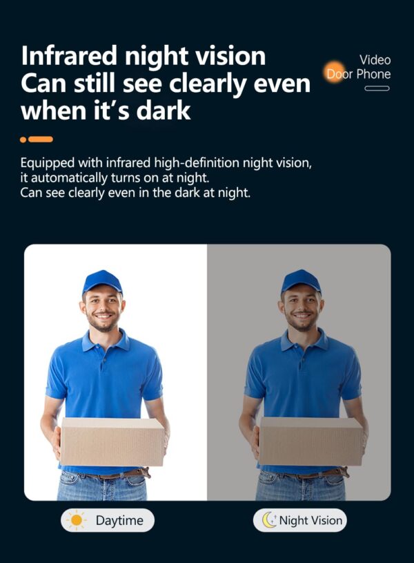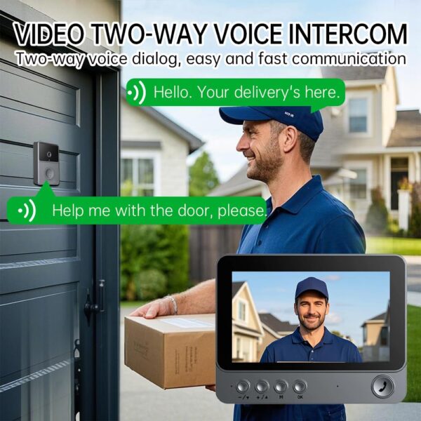- 【TWO-WAY AUDIO INTERCOM AND AUTOMATIC NIGHT VISION】 – Easily communicate with guests, delivery agents, or unknown visitors using the built-in speaker and high-sensitivity microphone, functioning like a visual door phone system. When someone rings the bell, the screen activates, and two-way conversation is enabled at the press of a button. Thanks to the high-power IR LED, night vision automatically adjusts to low-light conditions.