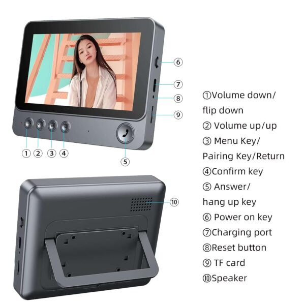 Details: Upgrade your home’s entrance security with the V5 Wireless Video Doorbell Camera a solution that combines a digital door viewer, peephole camera, and wireless door intercom system into one sleek and compact device. Ideal for apartments, villas, offices, and homes, this smart door eye offers a safer and smarter way to see who’s at your door without needing Wi-Fi or a smartphone. Equipped with a 0.3MP HD peephole lens and a 4.3″ TFT LCD monitor, the V5 allows you to clearly view visitors in real time. With a 70° wide-angle lens, night vision, and a two-way audio system, it functions as a complete home access monitoring system. Whether you call it a video doorbell, visual door phone, or entryway camera, the result is the same: complete peace of mind. Forget about complicated installations or constant app updates. This digital peephole viewer operates independently, letting you check who’s outside through the indoor screen. The built-in rechargeable li-ion battery (dual 800mAh) provides up to 7 days of standby time, and recharging is quick and easy via Type-C cable (adapter included, fast chargers not supported). With support for up to 128GB TF card storage, you can record snapshots or videos of every visitor. Whether it’s for personal security, elderly safety, or daily convenience, this smart doorbell intercom gives you reliable, wire-free monitoring at your fingertips. All in One Doorbell & Digital Viewer – Combines a smart camera, screen, and two-way audio intercom. No Wi-Fi Needed – Fully self-contained system with no phone or app connection required.4.3” Color Display – Sharp and clear viewing via built-in indoor screen. 70° Wide-Angle Lens – Broad coverage to see more of your entrance area. Day/Night Monitoring – Built-in IR sensor enables low-light visibility. Two-Way Talk – Speak with visitors via the screen like a visual door phone.Battery-Powered Convenience – Rechargeable dual lithium battery, Type-C charging.
