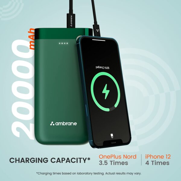 - Enormous 20000mAh Capacity- Lithium Polymer 20000mAh capacity allows you to charge your devices multiple times. It can charge iPhone 12 – 4.6 times, Samsung M11 – 2.6 times, iPad Pro 11 – 1.7 times.