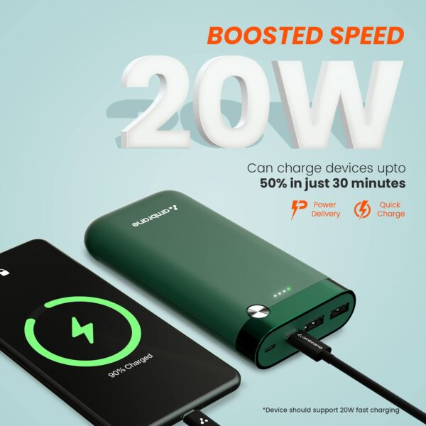 Ambrane 20000mAh Powerbank, 20W Fast Charging, Triple Output (2 USB & 1 Type C), Power Delivery, Quick Charge for iPhone, Android & Other Devices, Made in India + Type C Cable (PP-20 Pro, Green)