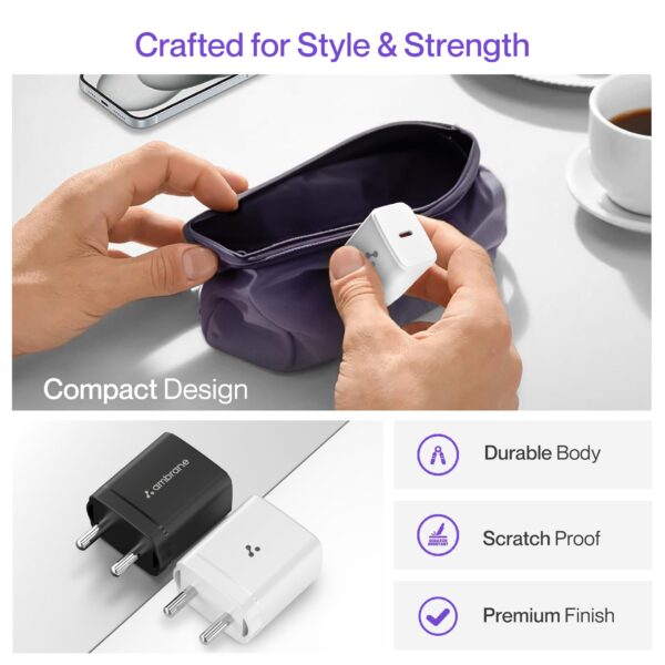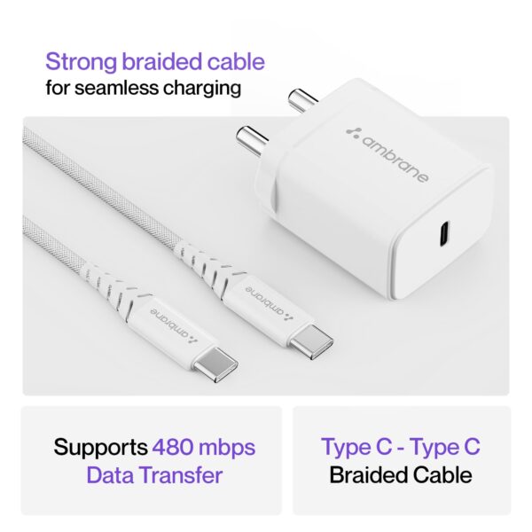 Ambrane 25W Mobile Charger Adapter with Charging Cable | Fast Charging for Samsung Smartphones, iPhone 15/14/13/12/11/X & Pro Series & Other Type-C Devices (Charge 25, White)