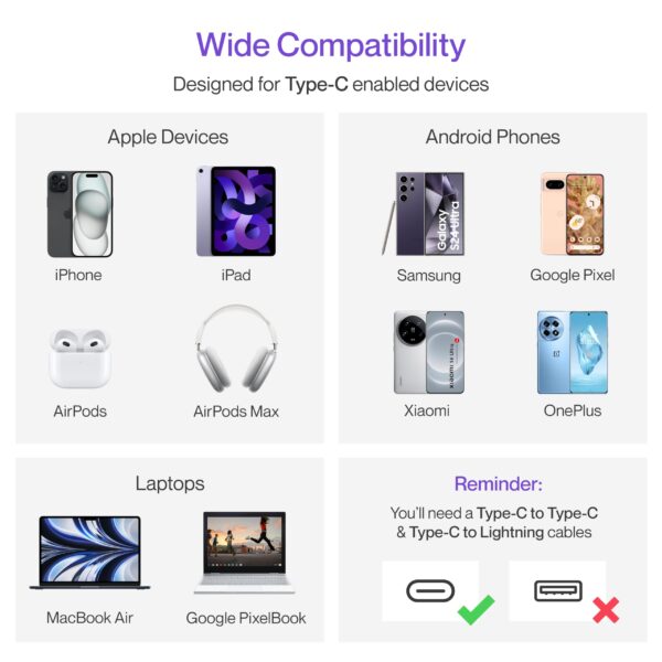 - Type-C Compatibility: Compatible with a wide range of Type-C devices, including Samsung, Google Pixel, iPhones, iPads, and more. Ideal for Samsung phones, it ensures seamless compatibility and fast charging.