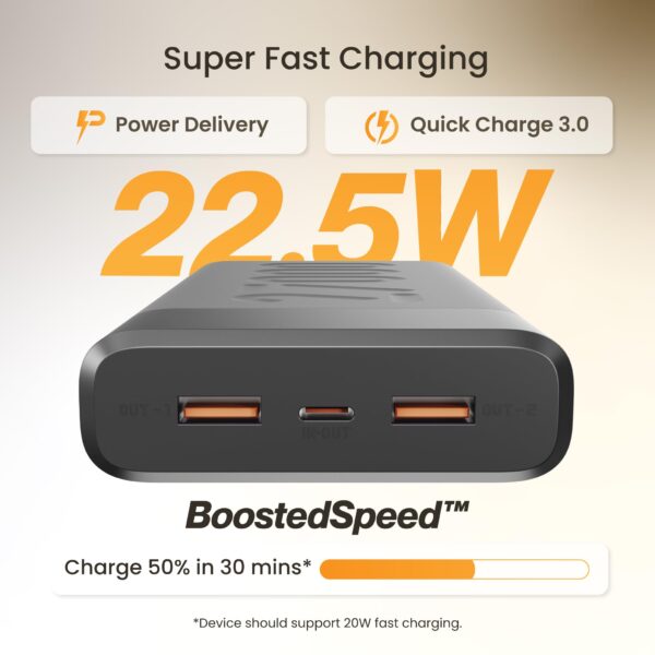 - Fast Charging Output – Equipped with 22.5W output, this powerbank ensures fast charging so you can stay ahead of the game. On average, it can charge your mobile up to 50% in just 30 minutes.