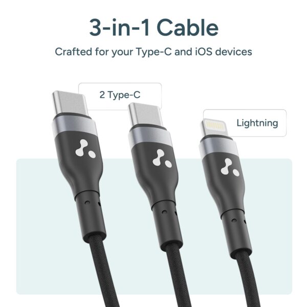 - 3-in-1 Versatility: Combines Type-C to two Type-C connectors and one Lightning connector, offering compatibility with iPhones, Type-C devices, laptops, and more.