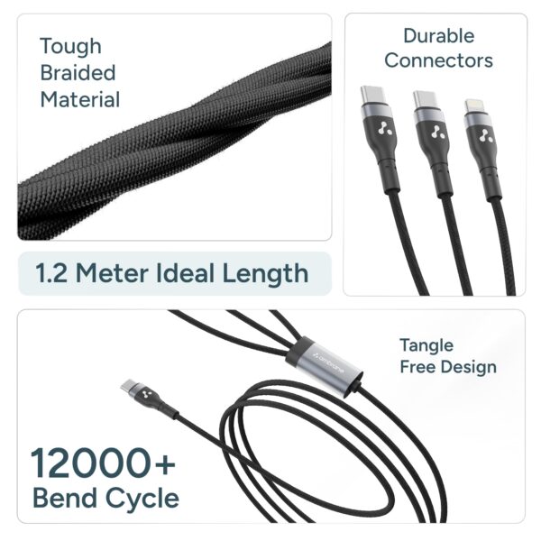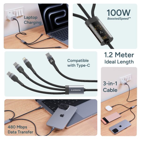 Ambrane 3 in 1 100W Fast Charging Cable, 3Amp Multi Charger Cable for Micro USB, iOS and Type-C Devices, 480 Mbps Data Transfer Rate for Mobile Tablet PC Laptop Android Smartphone with 1.2meter cable