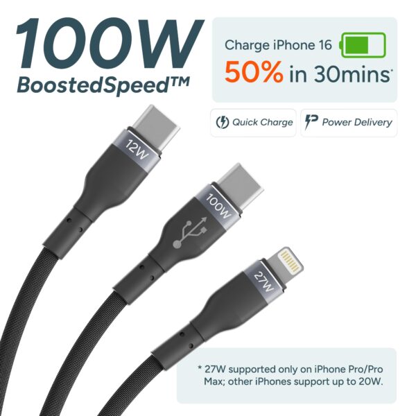 - Multiple Power Outputs: Type-C to Type-C1: 100W and 480 Mbps data transfer rate. Type-C to Type-C2: 12W output.Type-C to Lightning: 27W output for iPhone charging.