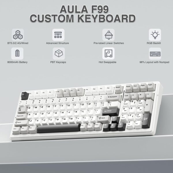 AULA F99 Wireless Mechanical Keyboard | Tri-Mode BT5.0/2.4GHz/USB-C Hot Swappable | Pre-lubed Linear Switches, Gasket Structure | RGB Backlit Gaming Keyboard (Grey+White – Graywood Switch)