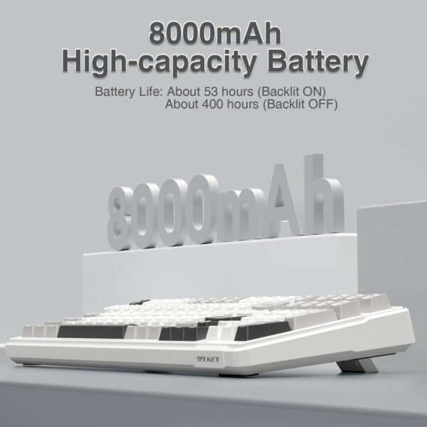 - 【PBT Keycaps & 8000 mAh Battery】99 keys 96% layout compact keyboard can save more desktop space while keep necessary arrow keys and number area for games and work. The rechargeable keyboard built-in 8000 mAh large capcacity battery to provide more power and longer battery life. Double shot PBT keycaps, made from two colors material molded into each others, make the keycaps characters maintain the vibrance and saturation, clear and not fade.
