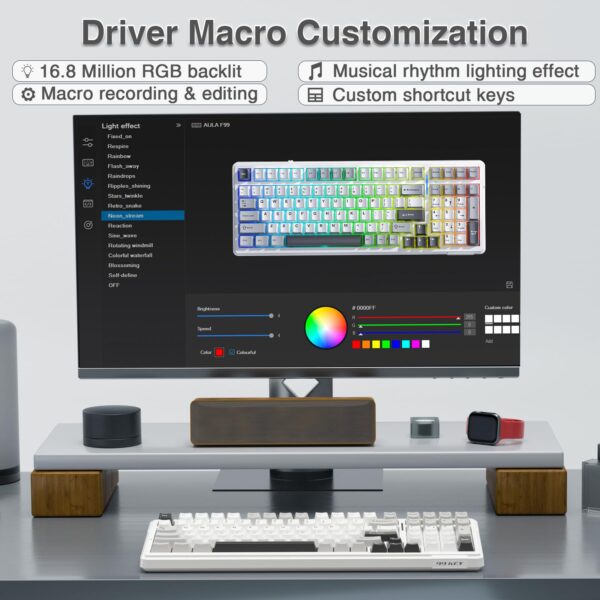 - 【Mechanical Gaming Keyboard】F99 is a premium mechanical keyboard for both work and game. With 16 RGB lighting effect to add a great atmosphere to the game room. All keys support macro customization, which allows macro recording and editing, customize key function and 16.8 million light colors, and supports cool music rhythm lighting effects with driver. N-key rollover, keyboard can respond to multiple key presses at the same time, which is helpful in very exciting real-time games.