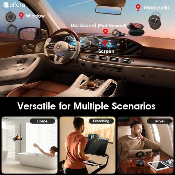 Elfora Vacuum Magnetic Dashboard Phone Holder | 360° Adjustable & Foldable Hands-Free Suction Mount for Car/Gym/Mirror | Strong MagSafe Compatible with iPhone Android and All Smartphones (Black)