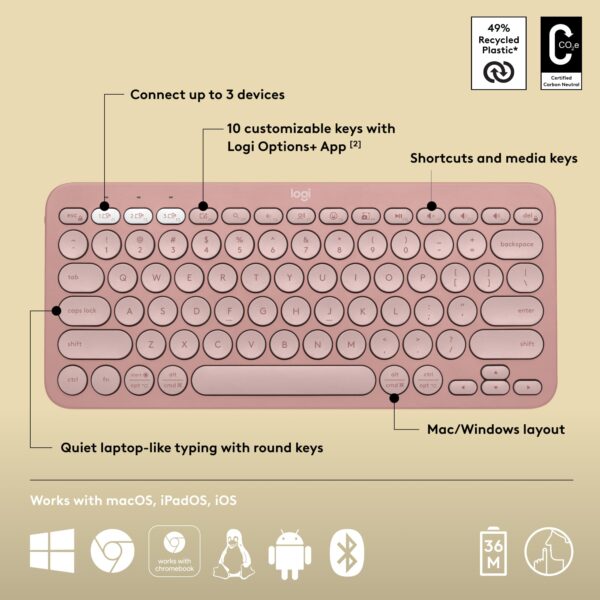 Logitech Pebble Keys 2 K380s, Multi-Device Bluetooth Wireless Keyboard with Customisable Shortcuts, Slim and Portable, Easy-Switch for Windows, macOS, iPadOS, Android, Chrome OS – Tonal Rose