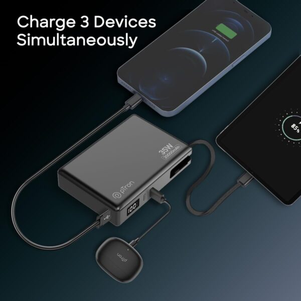pTron Dynamo Sprint 20000mAh 35W Super Fast Charging, USB Type-C Input Power Bank Compatible with QC3.0/PD3.0, Built-in Charging Cable, 3 Charging Outputs, Type-C Input/Output Port (Black)