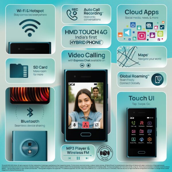 Details: HMD Touch 4G, World’s 1st Hybrid Phone, Touch UI, Express chat (Works across Android & iOS), Chat in 13 Indian languages, Cloud Apps, Maps, 2MP Rear camera, Front camera for video calls and selfies, Wi-Fi & Hotspot, Bluetooth, Micro SD Card upto 32GB, Type C Charging, Dual SIM, Auto call recording in folders, MP3 Player, Wired & Wireless FM, 1 Year Replacement Guarantee, 11 4G bands, ICE (In case of emergency) Key