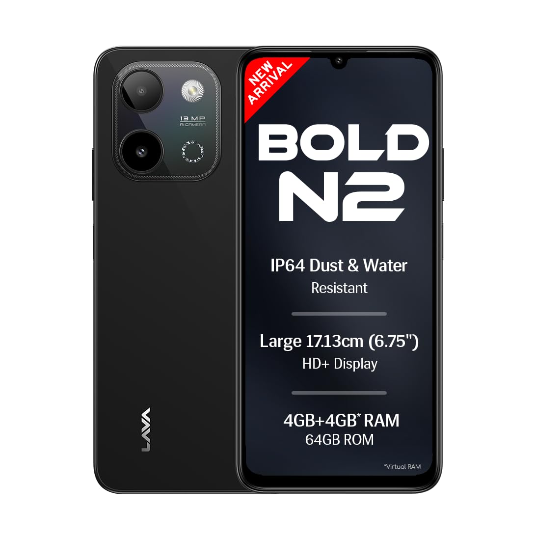 Refurbished Lava Bold N2 (Indus Black, 4 GB RAM, 64 GB Storage) | 13MP AI Dual Rear Camera | Largest 6.75″ HD+ Display | 5000 mAh Battery & 10W Charging | IP64 Water & Dust Proof | Charger & Phone-Case in Box