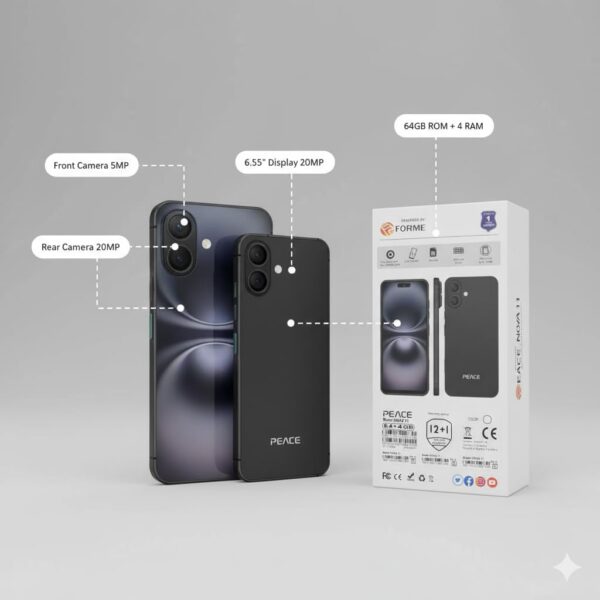 Details: Discover the PEACE NOVA 11, a sophisticated 4G smartphone that combines performance with practicality. Featuring a stunning 6.56-inch display with 120Hz pOLED technology, this device delivers smooth visuals and responsive touch interactions. The smartphone comes equipped with 4GB RAM and 64GB storage, expandable up to 128GB, ensuring you have ample space for your apps and media. Powered by the MTK6739 Octa-Core Processor and running on the latest Android 14, it offers efficient multitasking and a modern user experience. The device boasts a remarkable 20MP camera with OIS (Optical Image Stabilisation) for capturing sharp, steady photos. With its 5000 mAh battery, you can enjoy extended usage without frequent charging. The phone supports dual SIM functionality and comes with essential features including SMS, MMS, and voice input capabilities. The sleek black variant features a capacitive touchscreen with alphanumeric input support. Backed by a one-year company warranty, this smartphone represents a perfect blend of functionality and value, making it an excellent choice for users seeking a reliable daily driver.