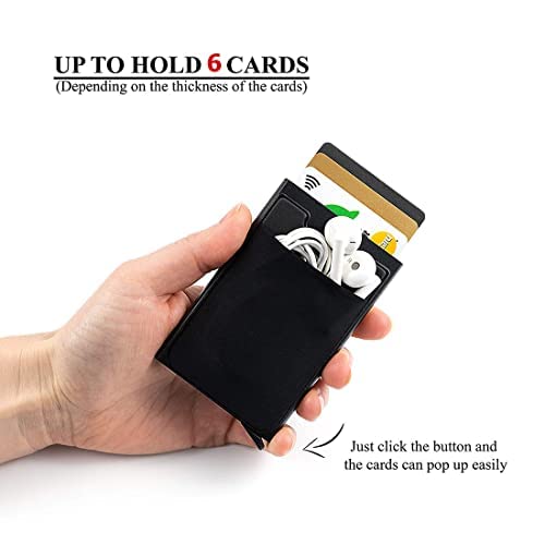 - NNOVATIVE DESIGN – Specially adopted the pop up design, simply click the ejector at the bottom,all cards slide out automatically, convenient to pick your card.And the soft arched inner edges can protect your cards from falling out.;HOLDS UP TO CARDS – Slim body but big volume, holding 6 flat cards / 4 embossed cards.