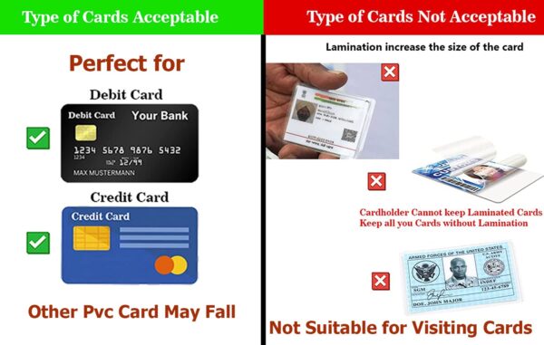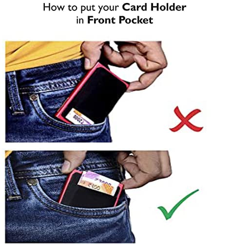 - The modern stylish design of this card wallet works perfectly for men and women. Features: RFID Protection for your credit cards, debit card, and ID Holds 6-8 Cards Slim Design – Fits great in a front or back pocket Durable – Will NOT Bend Perfect for Men or Women One Click Action – cards slide out easily.