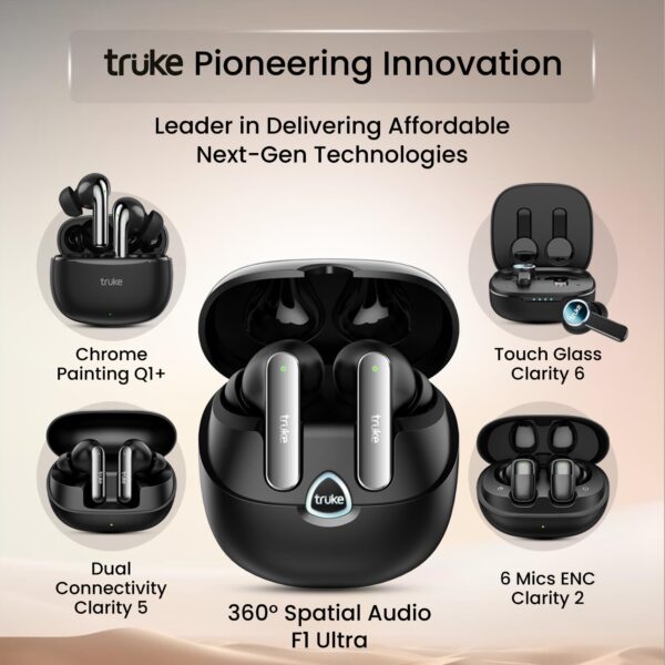 - 🌐 Immersive Spatial Audio Experience: Step into a world of unmatched audio with Truke Buds F1 Ultra airbuds , providing an extraordinary 360° spatial audio experience. Whether you’re engrossed in music or gaming, the surround soundscapes elevate your auditory senses to new heights, creating an immersive journey of sonic exploration and delight.