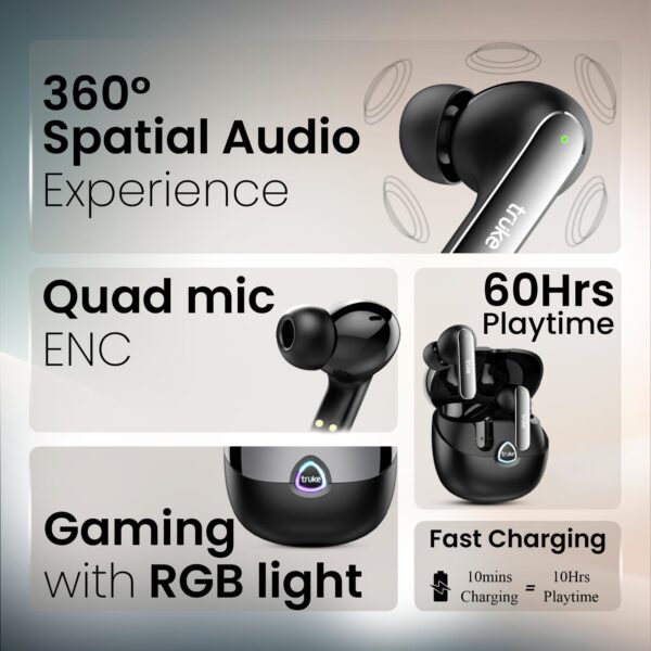 truke Buds F1 Ultra True Wireless in Ear Earbuds Spatial Audio Experience, 60H Playtime Ear Buds, Quad Mics Crystal-Clear Calls, Fast Charging, Bluetooth 5.3, Noise Cancellation, Gaming Mode (Black)