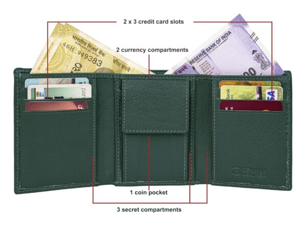 - COMPARTMENTS – The wallet has 6 in-build card slots, 2 currency slots, 3 secret compartments and 1 coin pocket