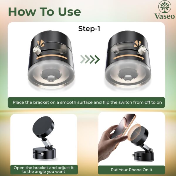 - Vacuum Suction Cup Base: Advanced vacuum suction technology ensures a firm grip on flat surfaces like car dashboards, office desks, or gym equipment.