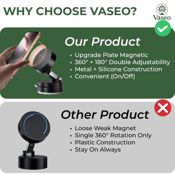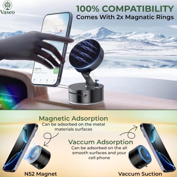 VASEO A2 Magnetic Phone Holder with Vacuum Suction | Dashboard Mobile Mount with Strong Grip | Shockproof Suction Cup Stand for Car, Office, Gym & Table – Obsidian Black