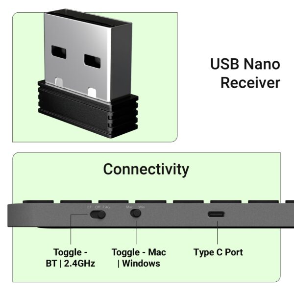 - Toggle: For seamless switching between connectivity, the keyboard comes with a BT| 2.4GHz toggle switch that allows you to choose your preferred connectivity mode while the MAC|Win toggle allows you to switch between the MAC and Windows modes.
